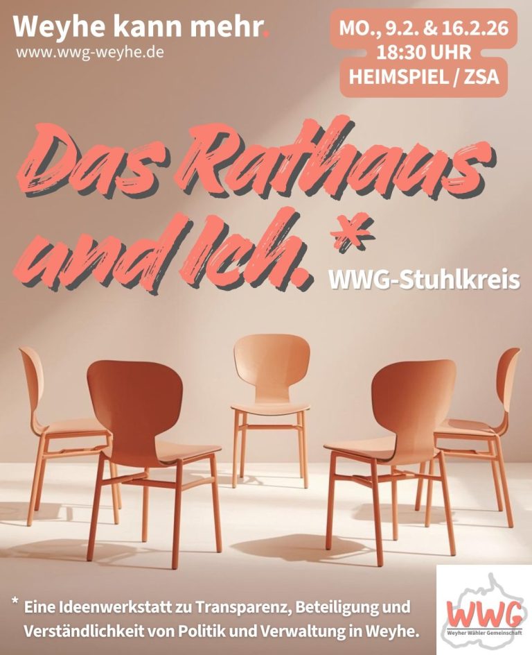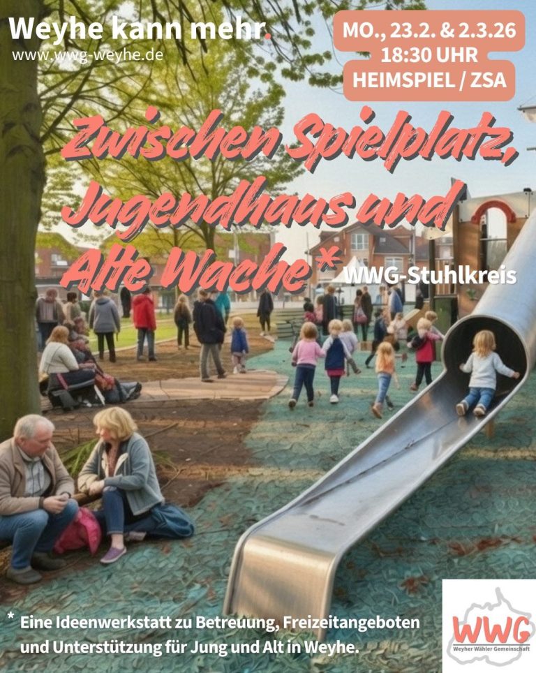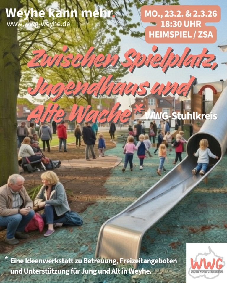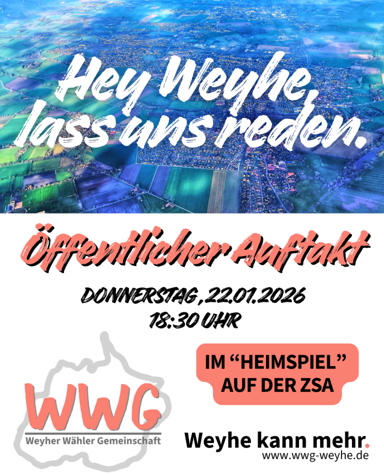Du interessierst dich für Weyhes Zukunft und möchtest wissen, wofür die WWG steht? Dann komm vorbei, lerne uns kennen und bring deine Ideen ein. Wir stellen uns vor, hören zu und sprechen darüber, wie wir Weyhe gemeinsam gestalten können – offen, respektvoll und lösungsorientiert.